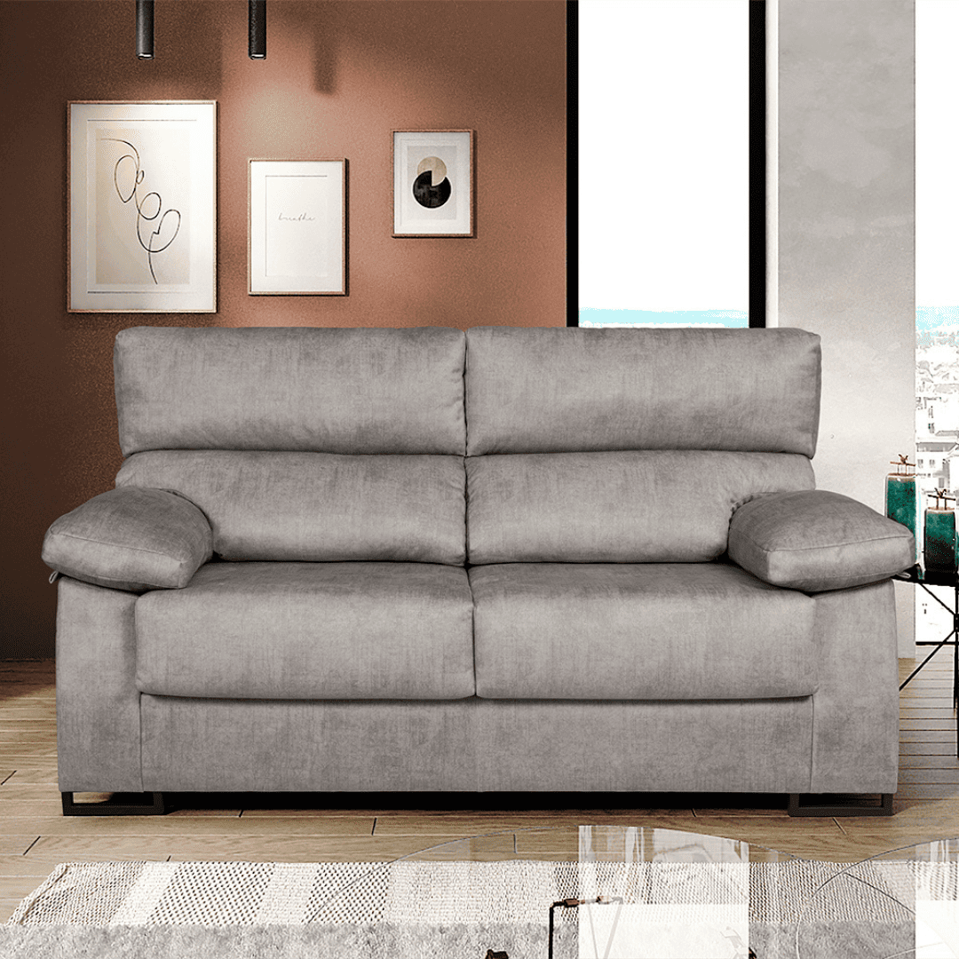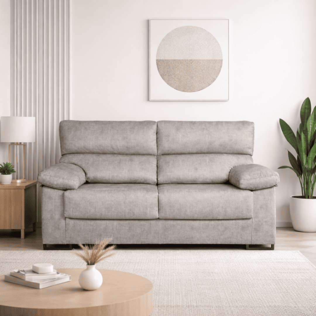 El Sofá Bombay es un modelo robusto y confortable, diseñado para el uso diario. Incorpora asiento deslizante y respaldo reclinable, que permiten una postura cómoda y relajada. Destaca por su relleno de espuma de 28 kg y fibra siliconada 100 % virgen, junto a un sólido armazón de madera de pino. Sus patas metálicas aportan estabilidad y un toque moderno a un sofá funcional y resistente.