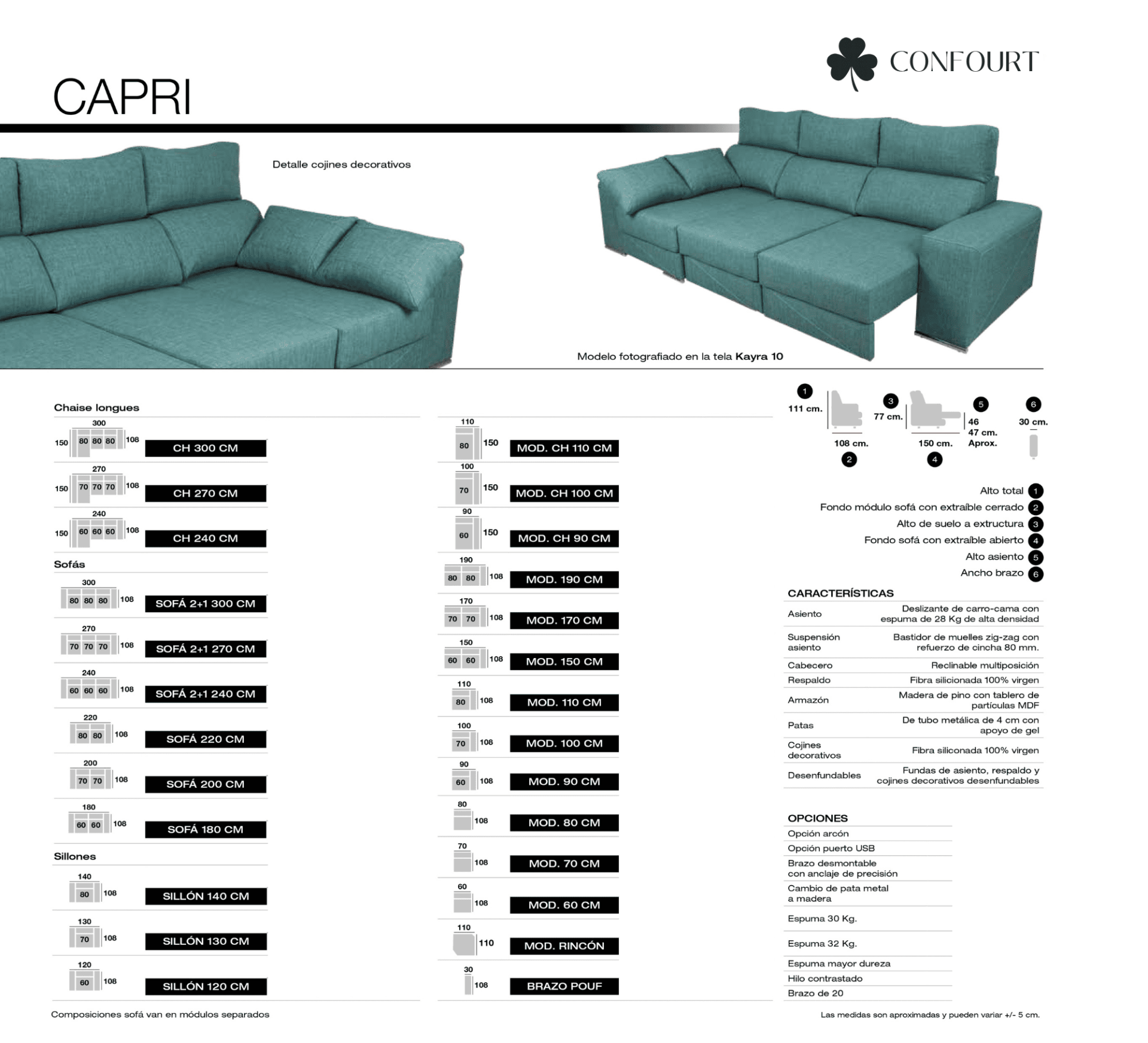 El Sofá Capri destaca por su estilo moderno y equilibrado, ideal para salones actuales. Incorpora asientos deslizantes con espuma de alta densidad, que aportan confort y resistencia. Su respaldo ergonómico y el relleno de fibra siliconada 100 % virgen garantizan una experiencia de descanso envolvente. Gracias a su estructura de madera de pino y MDF, el Capri ofrece estabilidad, durabilidad y un excelente comportamiento en el uso continuado.