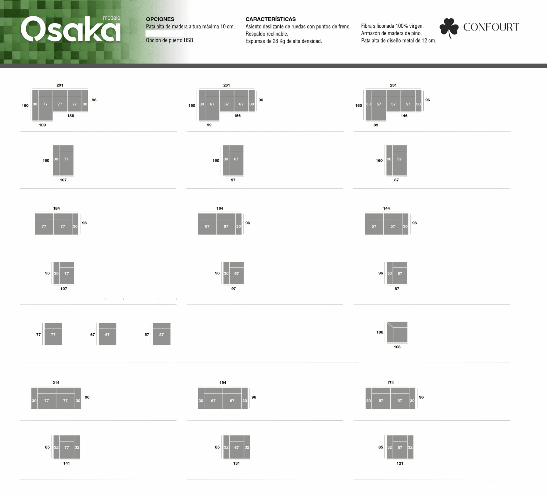 El sofá Osaka de Confourt destaca por su diseño moderno y modular, pensado para ofrecer máximo confort y adaptabilidad. Incorpora asientos deslizantes de ruedas con puntos de freno, junto a respaldos reclinables que permiten personalizar la postura. Sus espumas de 28 kg de alta densidad garantizan una sentada firme y duradera. El respaldo de fibra siliconada 100 % virgen, el armazón de madera de pino y las patas metálicas altas de 12 cm aportan comodidad, estabilidad y un estilo actual.